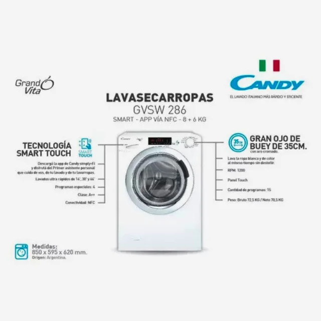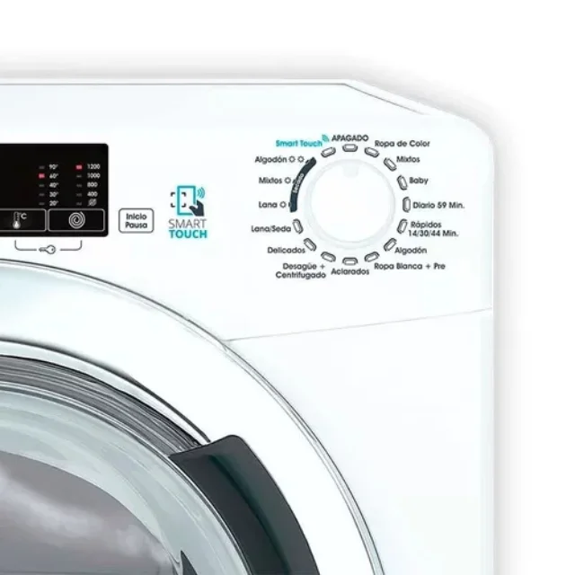 Los lavasecarropas Candy están equipados con la tecnología de proximidad Smart Touch, que te permite mejorar tu experiencia de lavado y secado. Podrás disfrutar de funciones adicionales, obtener consejos útiles sobre el uso más eficiente de tu electrodoméstico y tener acceso a una guía de solución de problemas, directamente desde tu smartphone.