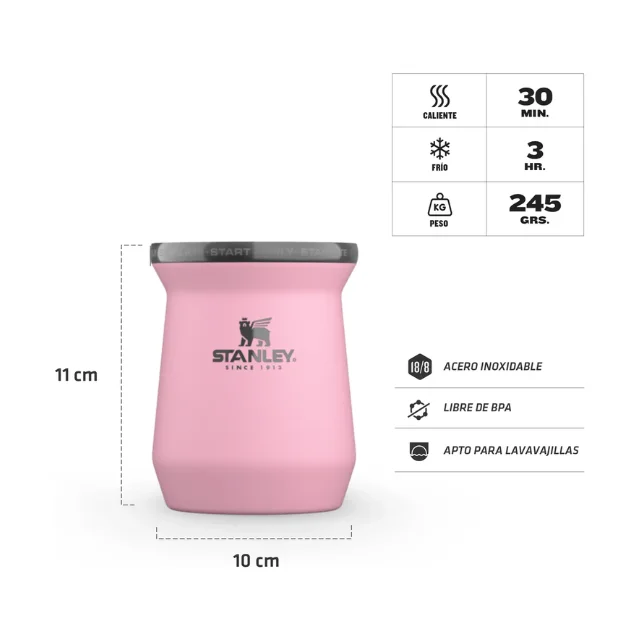 Con una capacidad de 236 mL, es el tamaño perfecto para satisfacer tus antojos sin complicaciones. Su diseño liso y elegante se adapta a cualquier ocasión, ya sea en casa, en la oficina o durante tus aventuras al aire libre. Este mate térmico mantiene tu bebida caliente por más tiempo, realzando así la experiencia de cada sorbo.