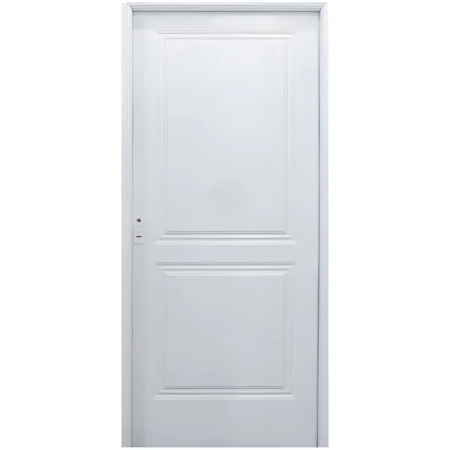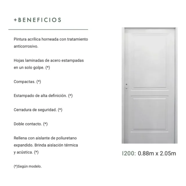 Diseño clásico, línea Eco de dos tableros ciega. Inyectada, de acabado anticorrosivo blanco, cerradura colocada. Doble contacto sin accesorios. Medidas finales aproximadas: 0,88 m de ancho x 2,03 m de alto.