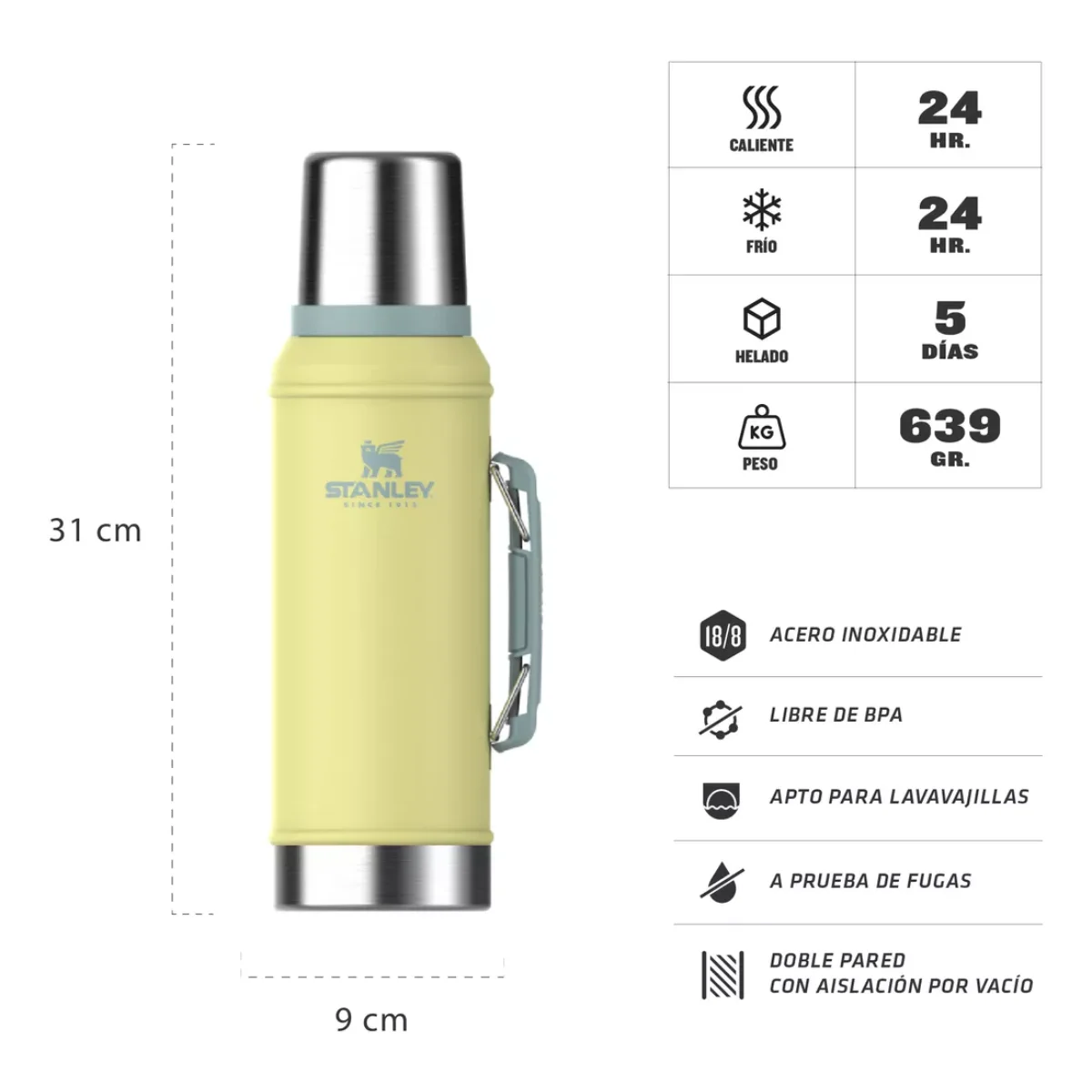 Porque algunas cosas son para toda la vida, este termo Stanley fue pensado para acompañarte a través de los años, ya que durabilidad y estilo son las palabras que definen a la marca. Gracias a su resistencia, obtendrás un gran rendimiento térmico y garantizarás que el líquido permanezca con la temperatura ideal por más tiempo. Además, al ser a prueba de fugas, dejarás de preocuparte por posibles derrames mientras realizás largos viajes o de camino al trabajo.