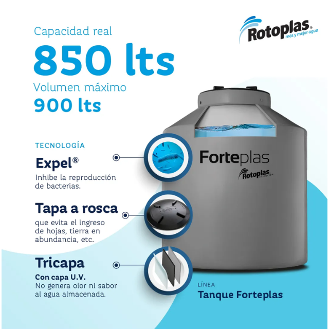 Tanque de agua Forteplas by Rotoplas Tricapa te permitirá almacenar agua en las mejores condiciones y conservar todas sus propiedades para utilizarla cuando necesites.