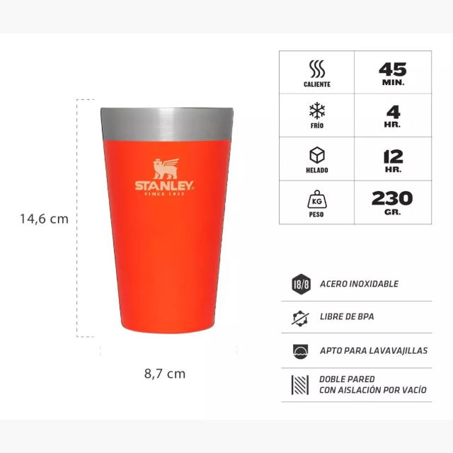 Vaso Pinta Stanley 473 ml: perfecto para cervezas y bebidas. Mantiene frías hasta 4 horas y calientes 45 min gracias a su doble aislamiento. Fabricado en acero inoxidable 18/8, libre de BPA y apto para lavavajillas. Resistente, apilable y duradero. ¡El vaso ideal para cualquier ocasión!